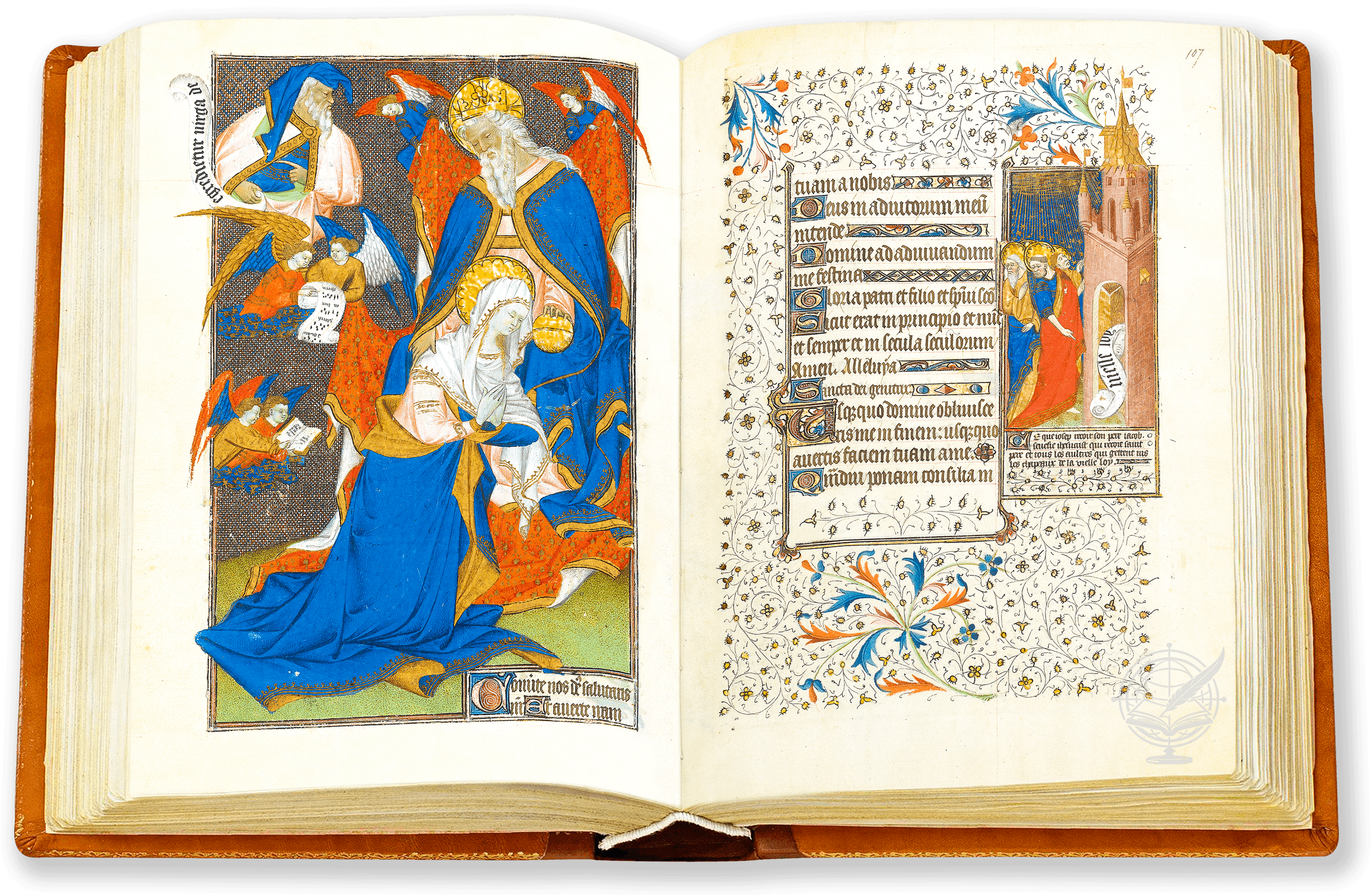 Open book facsimile of the Grandes Heures de Rohan (Bibliothèque Nationale de France, ms. Lat. 9471), bound in Dutch in two-colour leathers over wood covers and spine stamped in gold. Folio 107 is shown.