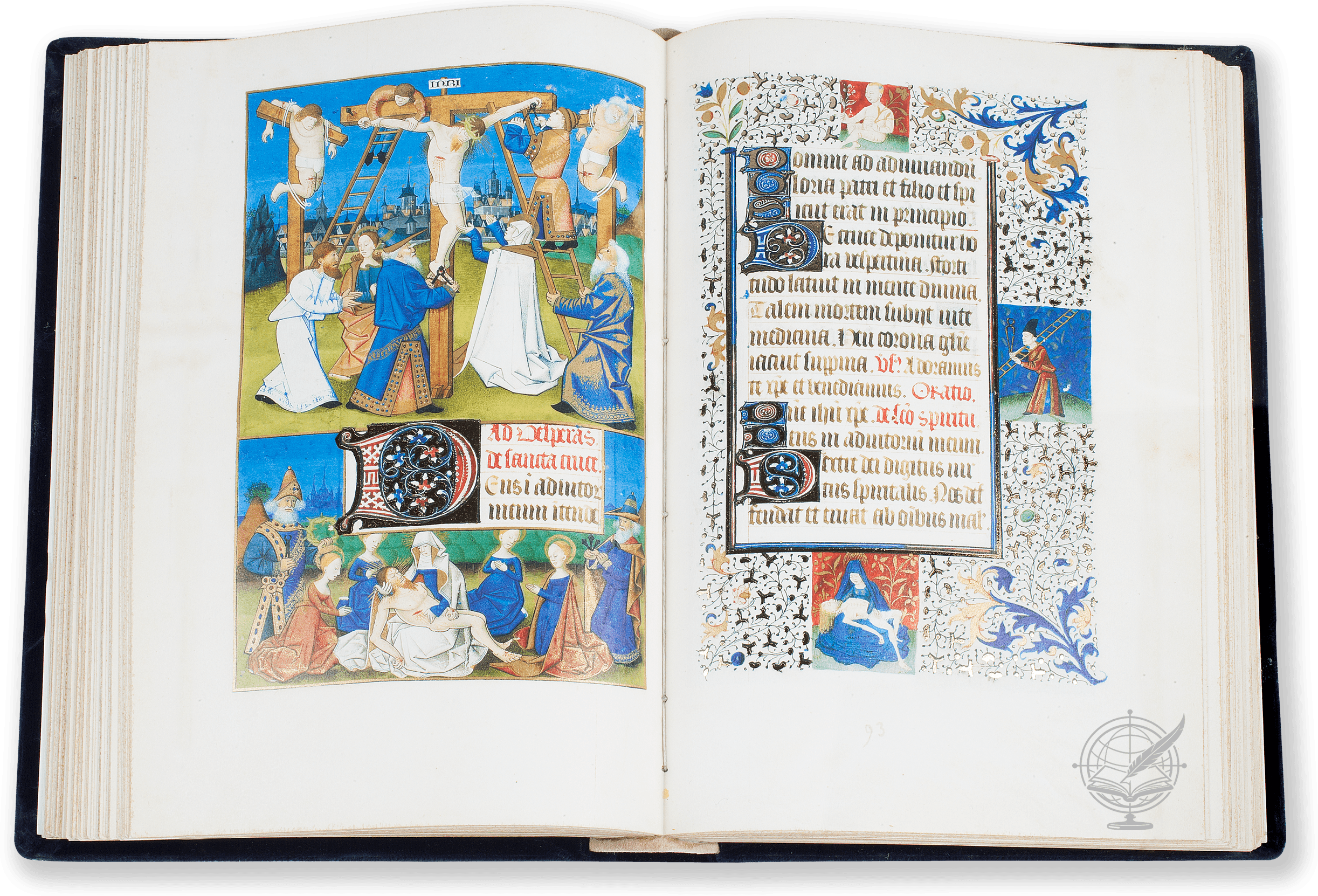Open facsimile of the Gulbenkian Book of Hours (Calouste Gulbenkian Foundation of Lisbon, ms. Lat. 135), bound in blue velvet.