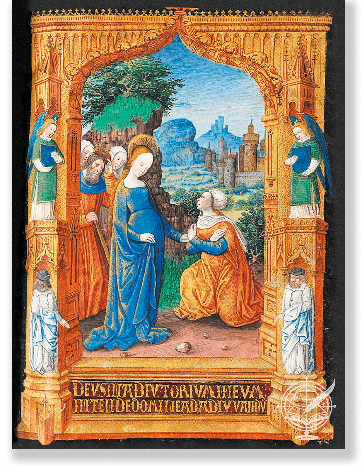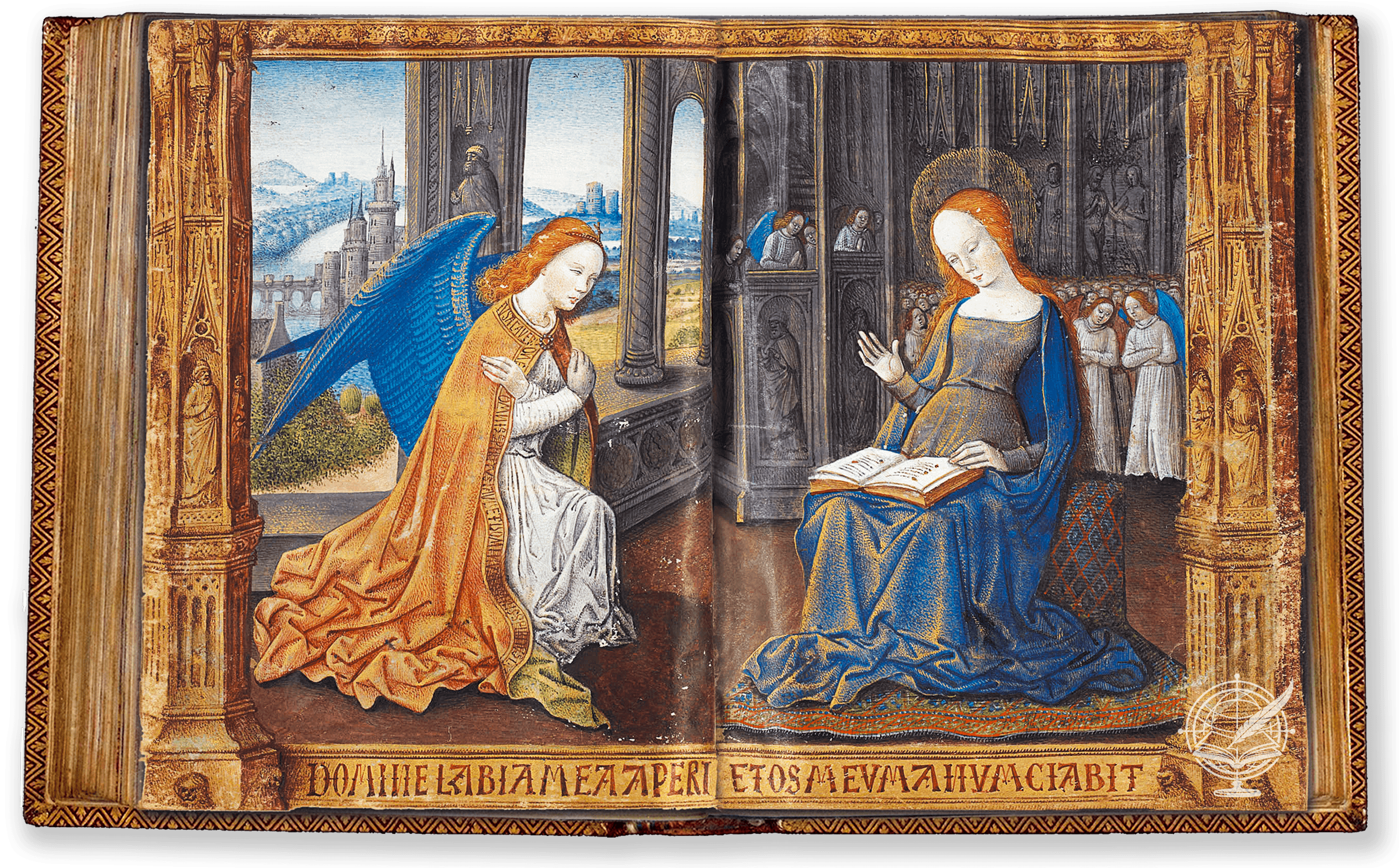 Cada una de las trescientas páginas del manuscrito transmite opulencia a través de intrincadas decoraciones. Las páginas, que contienen elementos habituales de un libro de horas, como fragmentos del Evangelio, el Oficio de la Virgen María, Salmos y textos religiosos, están adornadas con miniaturas a página completa y doble página. Estas narraciones visuales, incluida la sorprendente Anunciación, están encuadradas en marcos arquitectónicos similares a pinturas sobre tabla. El manuscrito cuenta con cientos de obras pictóricas más pequeñas, que acompañan a los textos devotos de una manera espléndidamente ilustrativa. Cabe destacar que las miniaturas al pie de página y las iniciales historiadas enriquecen aún más la opulencia del manuscrito.